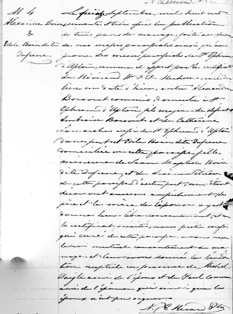 Qu'est-ce qui arrive à Alexandre Boisvert après le 22 janvier 1864? Aucune trace de lui et de son épouse n'est trouvée, mais Odile Dufresne donne naissance à une fille, Sarah, probablement le 16 avril 1864. Elle donne naissance à une autre fille, Albina, le 11 avril 1867. Une troisième fille, Exilla, née en janvier 1870, décède en avril de la même année. Pourtant, aucun acte n'a été trouvé, que ce soit sous les noms de famille Boisvert, Monette, Dufresne ou Boin. Est-ce que le couple est protégé par le clergé? Dans les divers écrits, il est mentionné que Sarah et Albina naissent à Hull, alors que Hull n'est qu'une mission puisque le registre de la paroisse Notre-Dame-de-Grâce n'ouvre pas avant 1870. Aucune trace des baptêmes non plus à Pointe-Gatineau, Ottawa, Aylmer ou Buckingham. Est-il possible que les religieux n'aient pas enregistré les actes ou encore les aient inscrits dans un autre registre?