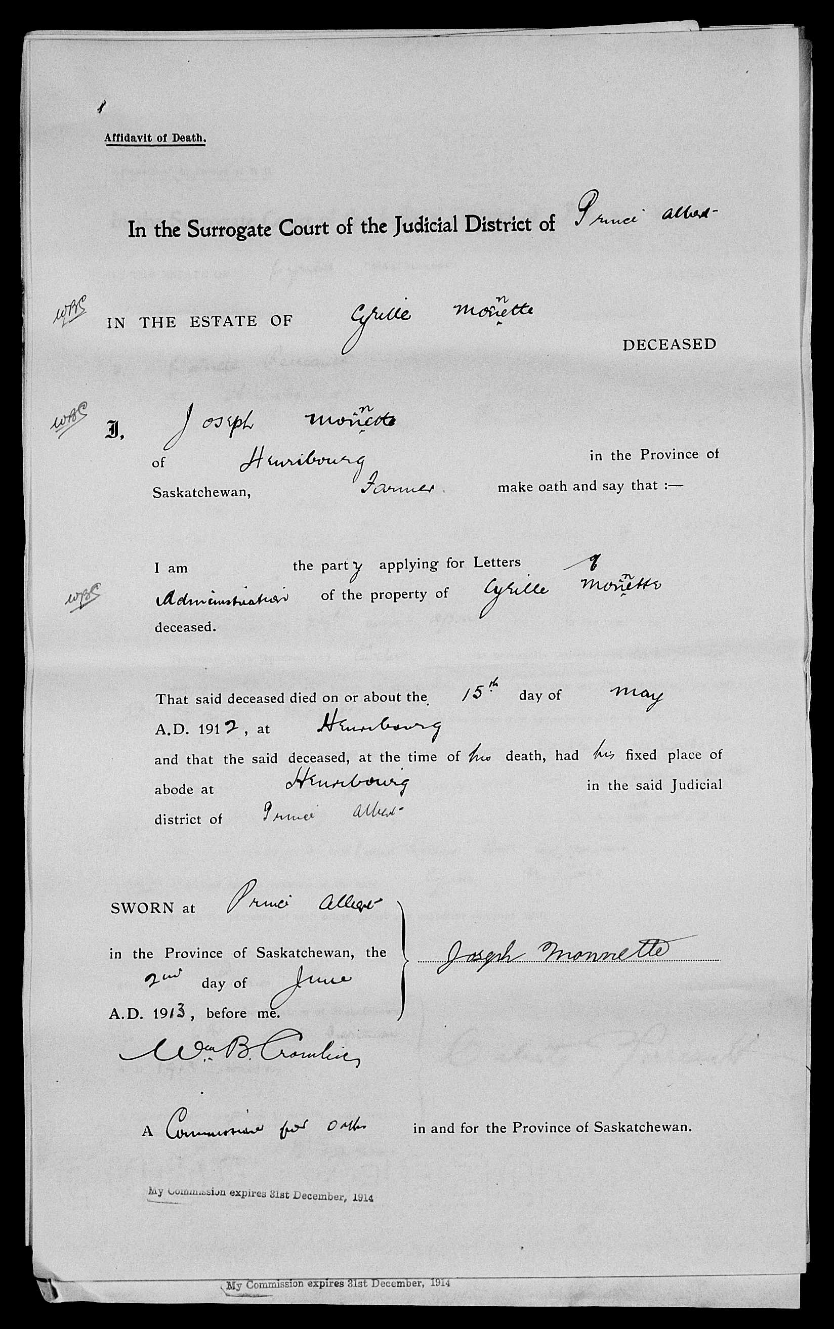 Ce texte explique clairement les réalisations de Cyrille à Monetville pendant environ 20 ans. Il est tout de même à noter qu'il y a des erreurs dans ce texte. La première concerne la date et le lieu de naissance d'Alexandre, puisqu'il naît le 4 mai 1842 et qu'à son baptême, à Chambly, il est mentionné que ses parents sont de la paroisse de Boucherville et non de Longueuil. Il est vrai que maintenant Boucherville fait partie du Grand-Longueuil. Erreur flagrante également, la date de décès de Cyrille, qui meurt le 15 mai 1912 selon les documents de sa succession à Henribourg et non le 18 mars 1912. Malheureusement, ce texte fait également quelques références au Petit Séminaire et à Louis Riel, qui sont de fausses informations
