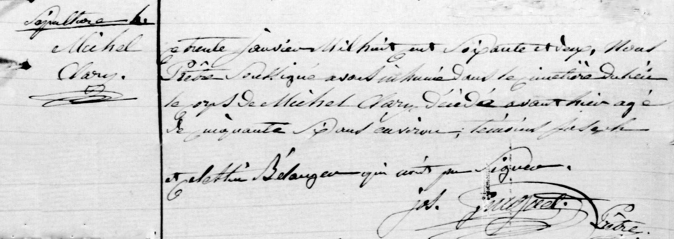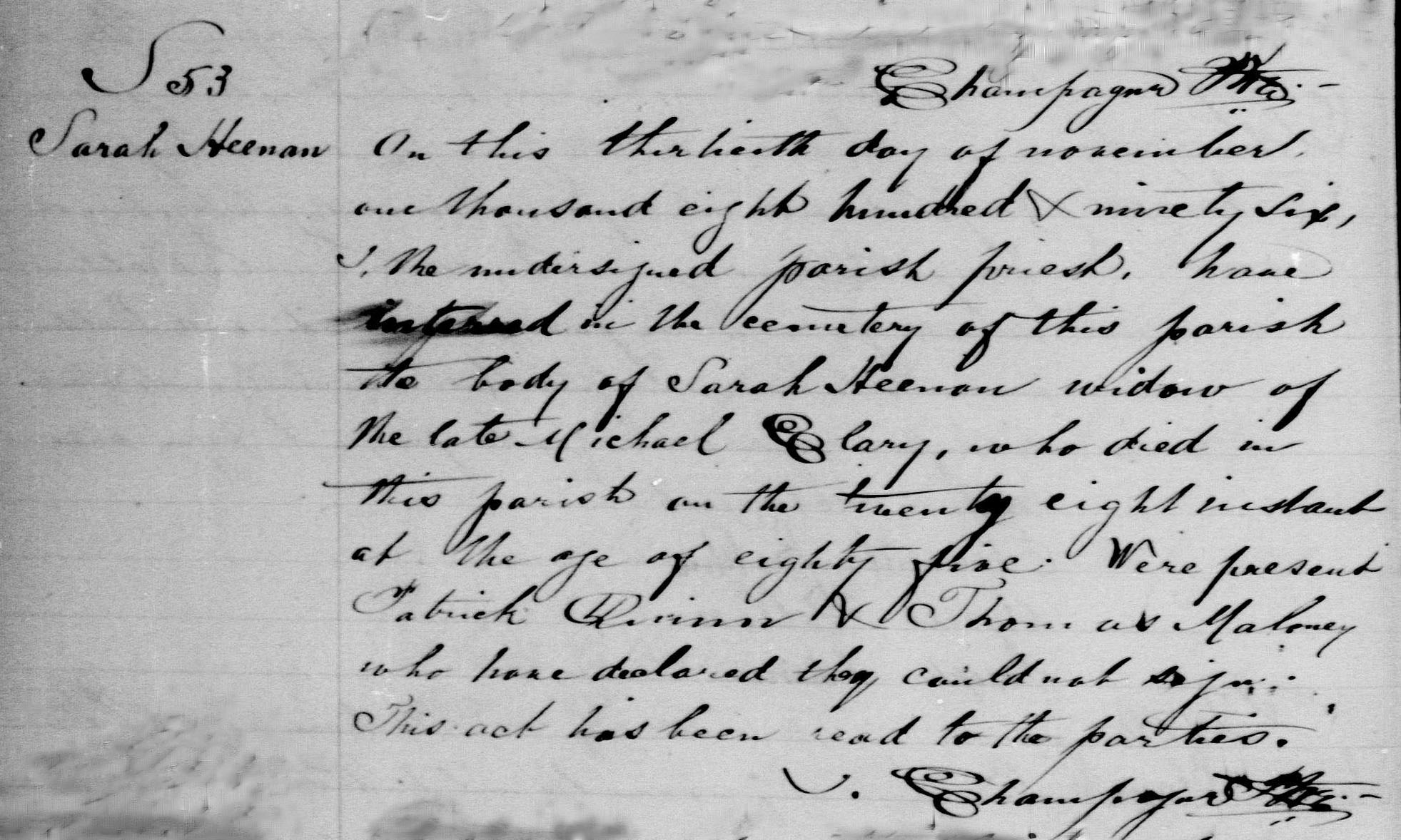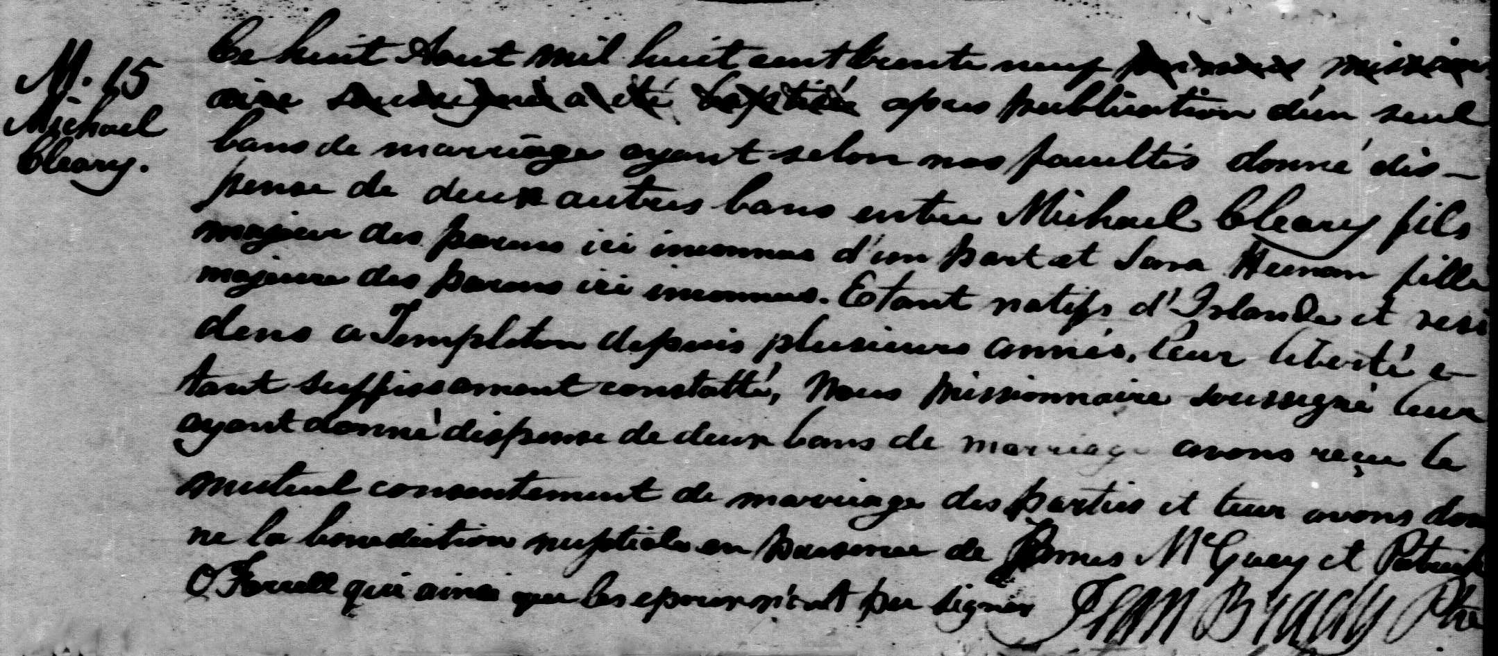 « … Michael Cleary fils majeur des parens ici inconnus d'un part et Sara Heenan fille majeure des parens ici inconnus. Étant natifs d'Irlande et residens a Templeton depuis plusieurs annés. Leur liberté etant suffissamment constatté , nous missionnaire soussigné leur ayant donné dispense de deux bans de mariage… »