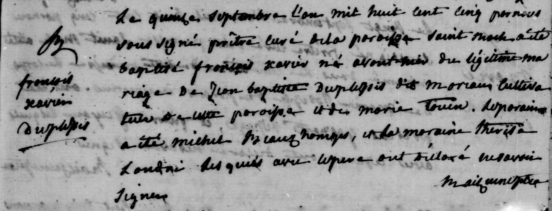 François-Xavier Moreau est né le 13 septembre 1805 et est baptisé le 15 à Saint-Roch-de-l'Achigan sous le nom de François-Xavier Moreau dit Duplessis. Il est le fils de Jean-Baptiste Duplessis dit Moreau et de Marie Touin. François-Xavier s'installe à Pointe-Gatineau vers 1834. Une histoire véhiculée depuis bien longtemps raconte qu'il est arrivé à Pointe-Gatineau vers 1830-1831 et qu'il est le serviteur d'un certain George Ouimet (en réalité Wilmet) boulanger de Sorel. Alors comment un boulanger peut-il gagner sa vie dans un lieu habitué par à peine une douzaine de familles? Si ce George Wilmet a vécu à Pointe-Gatineau, il n'y a certainement pas vécu longtemps avant de s'installer à Bytown (Ottawa).