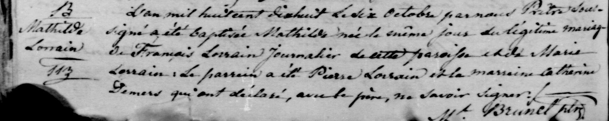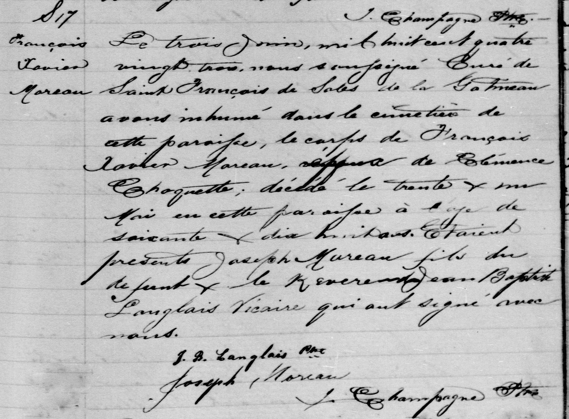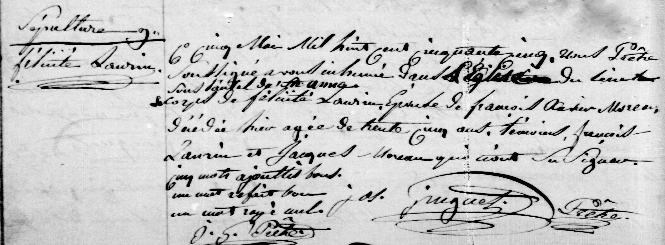 François-Xavier, fermier, acquiert certains morceaux de terre de la famille Wright. Ces terres situées dans le rang interrompu en front1 à Pointe-Gatineau sont les lots numéro cinq, six et sept toutes d'un peu plus de huit acres chacun au prix total de 66 livres, 1 shilling et 3 pennies et d'une rente annuelle de 3 livres, 18 shillings et 10 pennies. Le ruisseau Moreau bien connu des résidents du secteur de Pointe-Gatineau passe sur les terres du pionnier François-Xavier Moreau. Félicité Laurin a donné naissance à six enfants, dont la dernière Marie Léa née le 16 avril 1855. Malheureusement, Félicité ne se remet pas de l'accouchement et décède le 4 mai 1855.