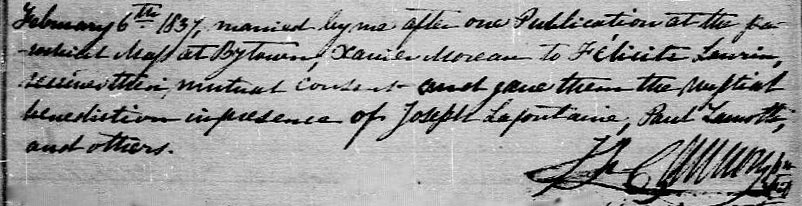 Le 11 août 1834, François-Xavier est parrain de Lucie Lorrain, fille de François Lorrain et de Marie Lorrain. Quelques années plus tard, il épouse Félicité Laurin, fille François Laurin et de Marie Lorrain, le lundi 6 février 1837 à la paroisse Notre-Dame de Bytown. Félicité Laurin est née le 6 octobre 1818 et est baptisée le même jour sous le prénom de Mathilde à la paroisse Saint-Martin, Île Jésus.