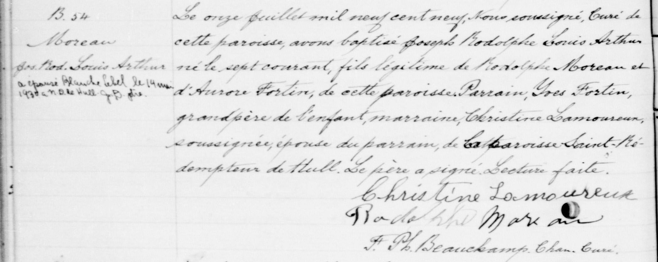Rodolphe Moreau, fils de Joseph Moreau et d'Elmire Cousineau, est né le 29 mars 1886 et il est baptisé à Pointe-Gatineau sous les prénoms de Joseph Oscar Rodolphe. Il épouse Marie Florence Aurore Fortin, fille de Joseph Louis Yves Fortin et de Christine Lamoureux, le 9 juin 1908 à Très-Saint-Rédempteur de Hull.